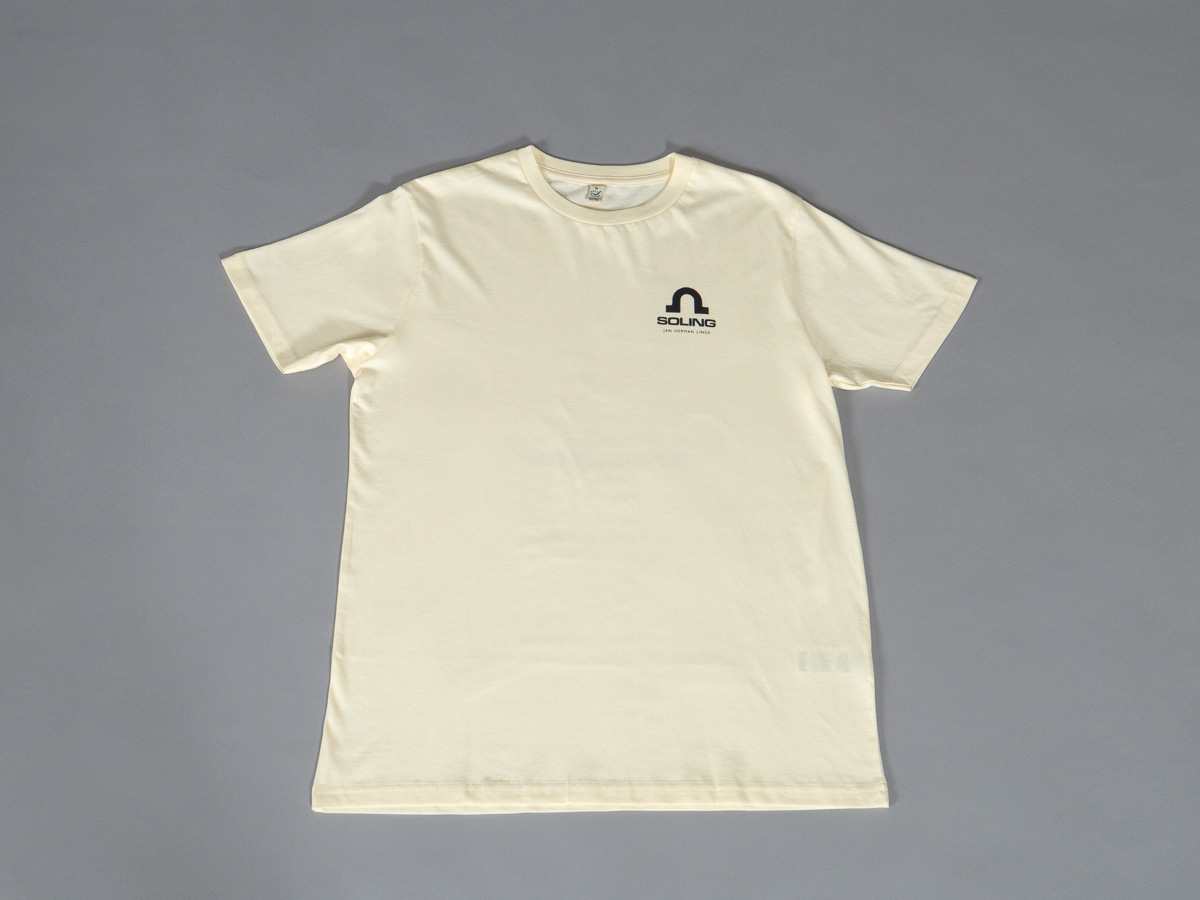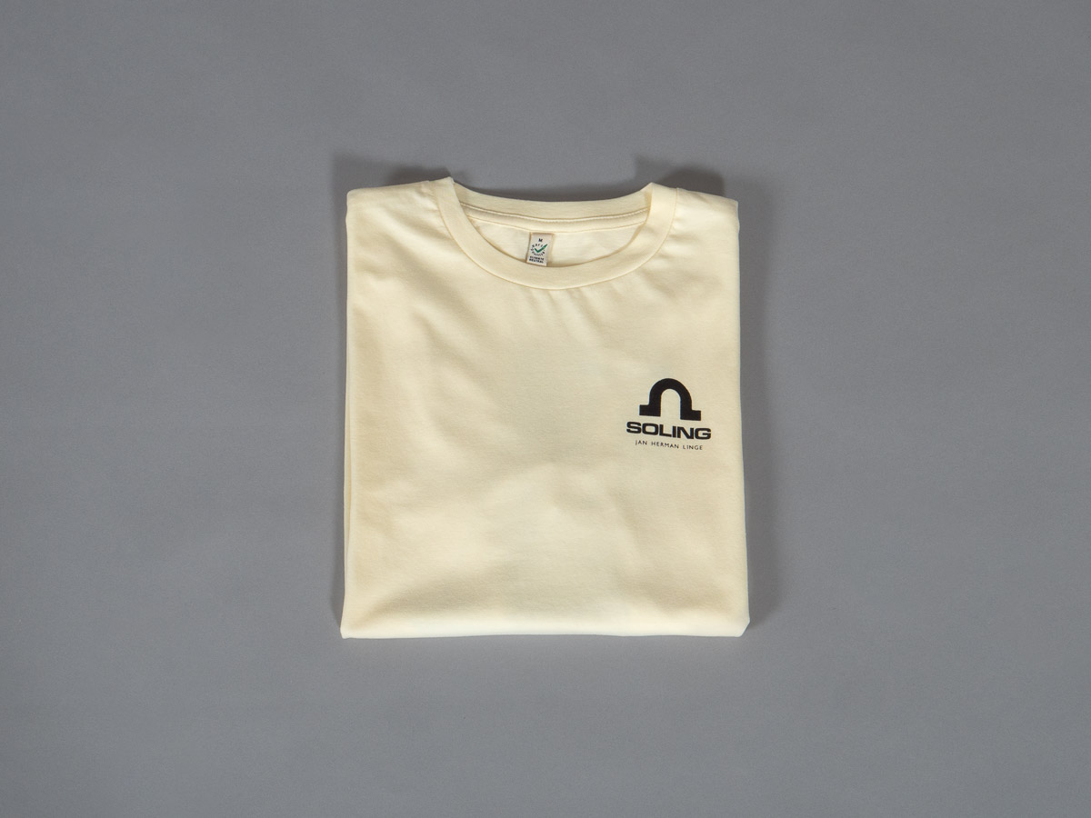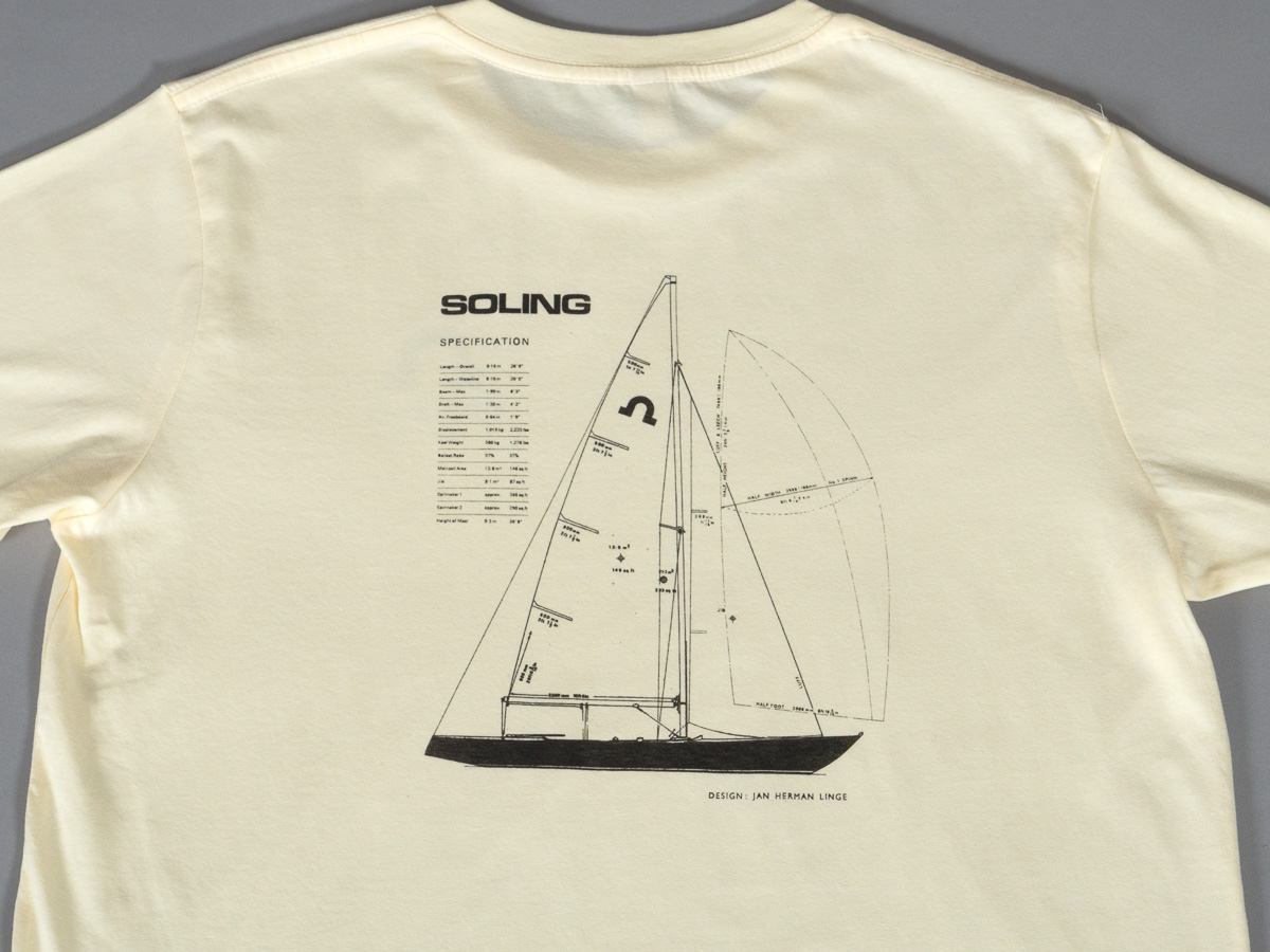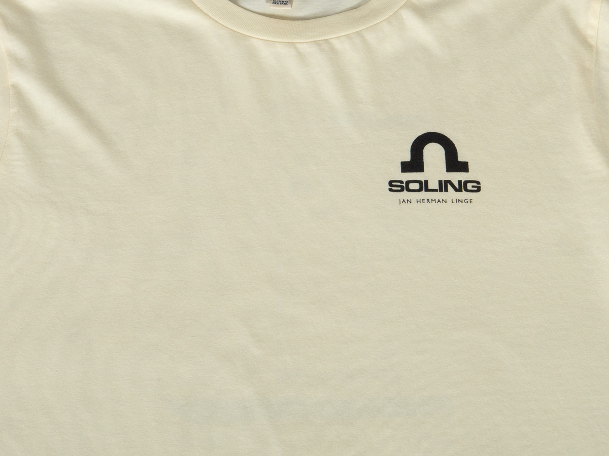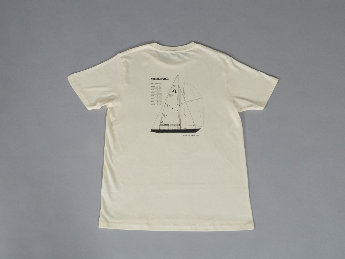 Soling T-skjorte med logo på bryst og Jan Hermans Linges originale tekniske tegninger på rygg.